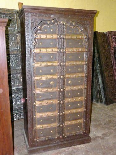 - This beautiful piece is made of teak wood in an antique warm brown finish with brass and iron accents all over the door.